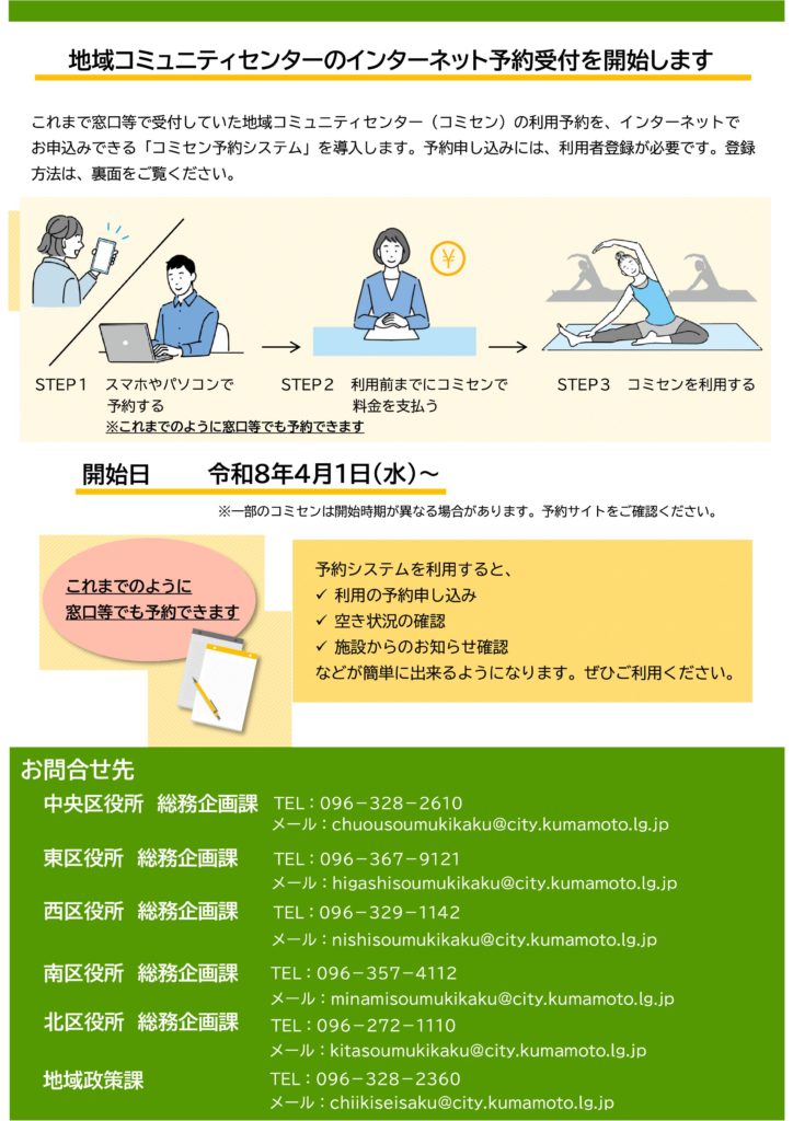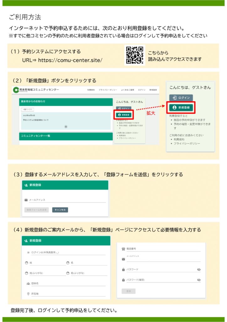 これまで窓口等で受付していた地域コミュニティセンターの利用予約を、インターネットでお申込みできる「コミセン予約システム」を導入します。予約申し込みには、利用者登録が必要です。
